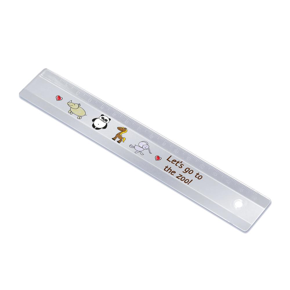 Stabiles 16 cm langes Lineal aus Kunststoff mit erhaben geprägter mm-Skala auf einer Seite. Standardmäßig ohne Druck. Loch auf einer Seite.
