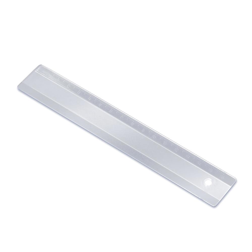 Stabiles 16 cm langes Lineal aus Kunststoff mit erhaben geprägter mm-Skala auf einer Seite. Standardmäßig ohne Druck. Loch auf einer Seite.