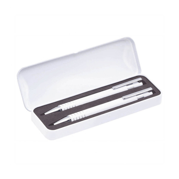 Set aus Druck-Kugelschreiber und Druck-Bleistift mit originellem, zweifarbigem Design. Beide in geschmeidiger Metall-Ausführung in lebendigen Farben mit Kontrastdetails in Silber. Mit geriffeltem Griff. Präsentiert in einem robusten, individuellem Metall-Etui mit Schaumstoff im Inneren. Kugelschreiber mit blauer Tinte und Bleistift mit 0,7 mm Minen.