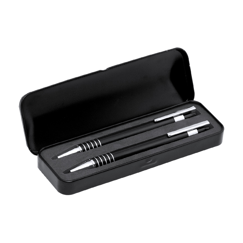 Set aus Druck-Kugelschreiber und Druck-Bleistift mit originellem, zweifarbigem Design. Beide in geschmeidiger Metall-Ausführung in lebendigen Farben mit Kontrastdetails in Silber. Mit geriffeltem Griff. Präsentiert in einem robusten, individuellem Metall-Etui mit Schaumstoff im Inneren. Kugelschreiber mit blauer Tinte und Bleistift mit 0,7 mm Minen.