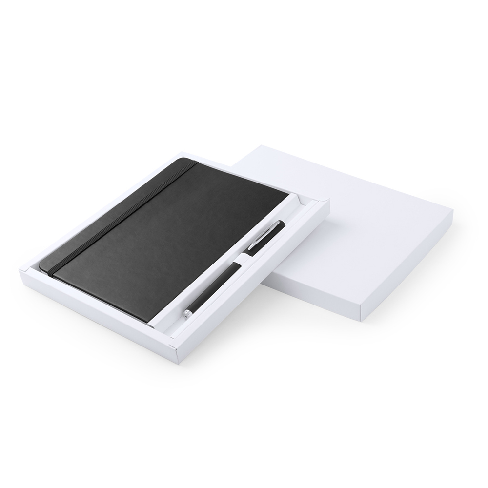 Set aus Notizblock mit Soft-Touch-Cover aus Kunstleder und Kugelschreiber. Mit 100 Blättern mit Gummiband zur Befestigung und farblich passendem Lesezeichenband. Präsentiert in einer eleganten Box aus weißem Karton mit Stanzung. Kugelschreiber mit blauer Tinte.