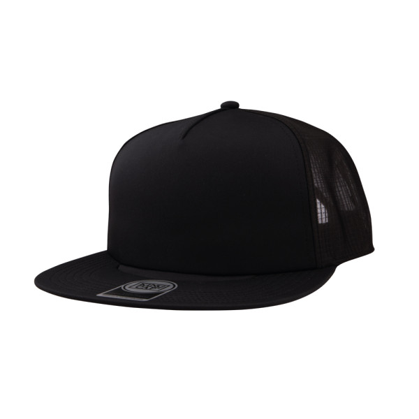 5 Panel Cap mit flachem Visor und Frontfütterung. Kunststoff-Schnappverschluss. Hergestellt aus recyceltem Polyester mit Mesh