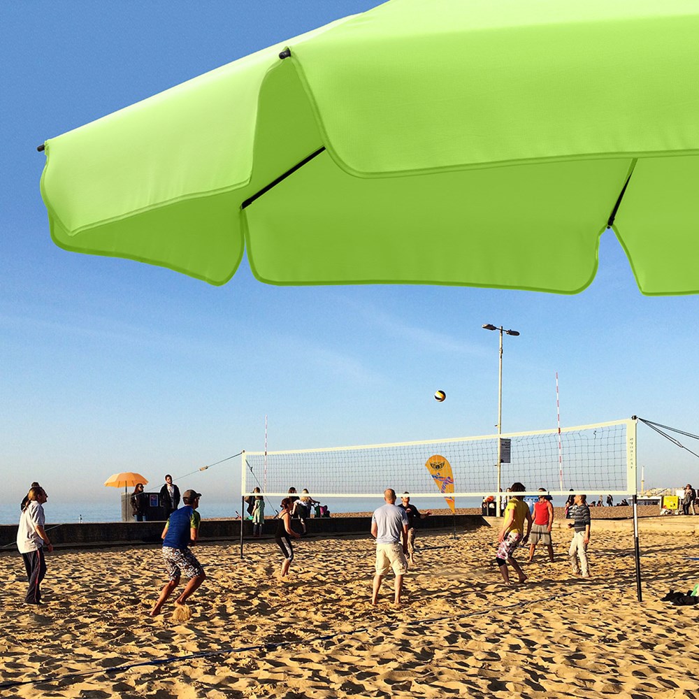 Moderner Sonnenschirm mit Gestell in Titan-Finish, Knickvorrichtung und mit Volant Einfache Handhabung durch Sicherheitsschieber, sehr stabile Fiberglasschienen, zweiteiliger und stufenlos höhenverstellbarer Stock mit Knickvorrichtung zur Neigung des Schirms, Stock in edlem Titan-Finish, Unterstock mit ca. 120 cm Länge und Drehfeststeller zur sicheren Fixierung, komfortables Tragefutteral, Bezug mit Lichtschutzfaktor UPF 50+, angeschnittenes Volant, exklusive Füllständer (Art. 8920 oder Art. 8905) / Erdspieß (Art. 8939)