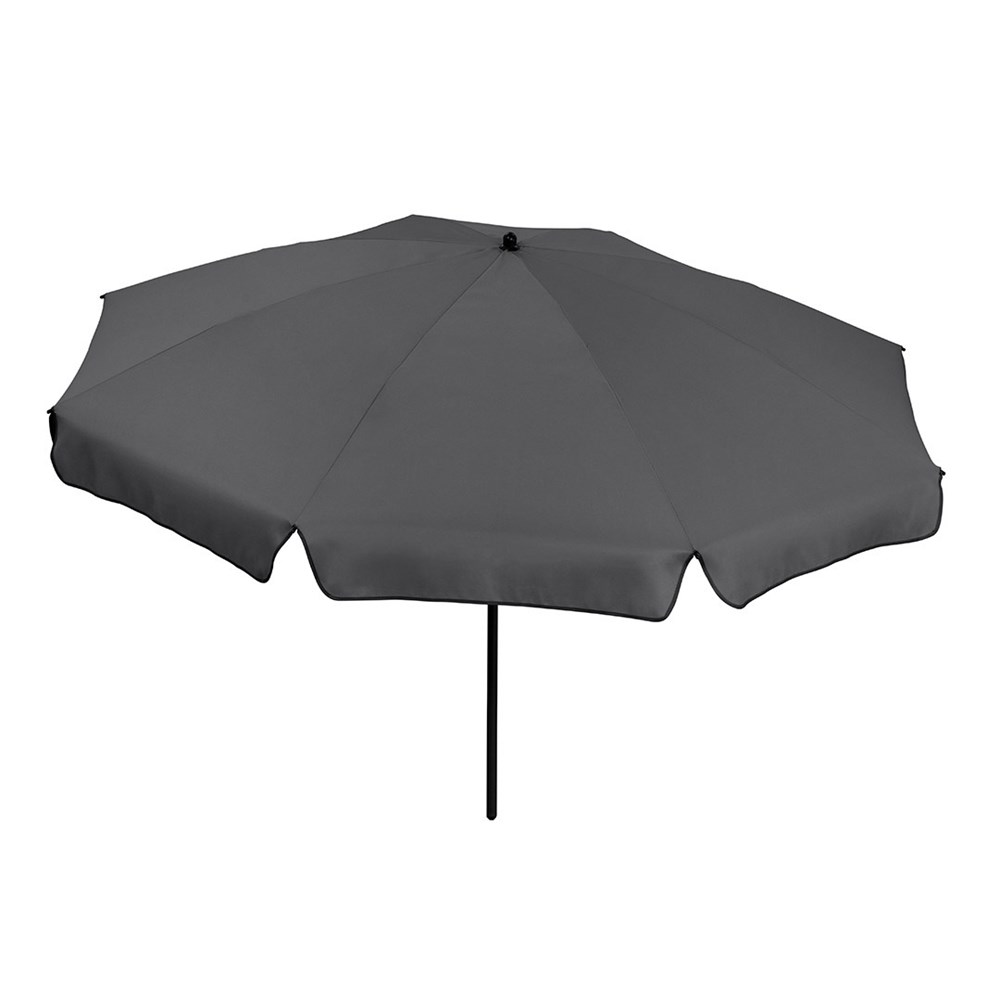 Moderner Sonnenschirm mit Gestell in Titan-Finish, Knickvorrichtung und mit Volant Einfache Handhabung durch Sicherheitsschieber, sehr stabile Fiberglasschienen, zweiteiliger und stufenlos höhenverstellbarer Stock mit Knickvorrichtung zur Neigung des Schirms, Stock in edlem Titan-Finish, Unterstock mit ca. 120 cm Länge und Drehfeststeller zur sicheren Fixierung, komfortables Tragefutteral, Bezug mit Lichtschutzfaktor UPF 50+, angeschnittenes Volant, exklusive Füllständer (Art. 8920 oder Art. 8905) / Erdspieß (Art. 8939)