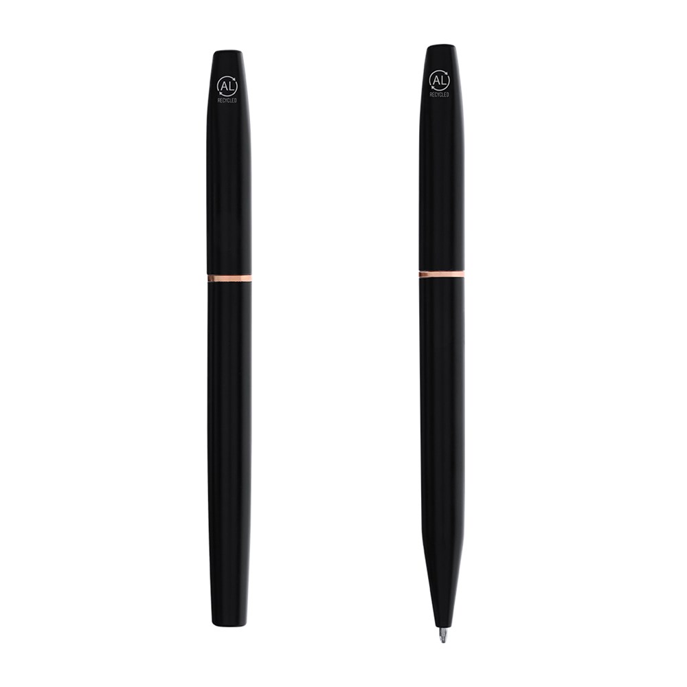 Kugelschreiber und Rollerball aus recyceltem Aluminium, im eleganten matten Schwarzdesign mit edlen Fittings in Rosa-Gold. Drehmechanismus beim Kugelschreiber und Kappe beim Rollerball, beide mit Metallclip. Mit blauer Tinte und recyceltem Aluminium Logo. Präsentiert in einem eleganten schwarzen Etui.Recyceltes Aluminium ist ein Material mit nahezu unendlichen Recyclingmöglichkeiten, das seine ursprünglichen Eigenschaften behält und weniger Energie im Verarbeitungsprozess verbraucht.GRS (Global Recycled Standard) Zertifizierung, die die recycelte Herkunft des für das Produkt verwendeten Materials garantiert.