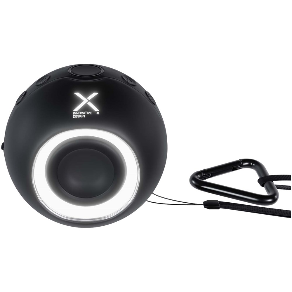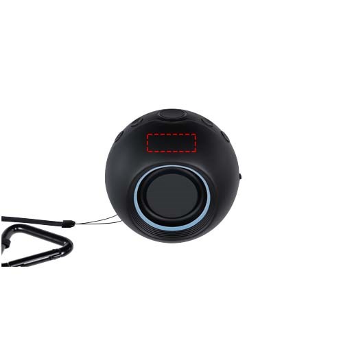 Kabelloser 10-W-Bluetooth®-Lautsprecher mit leuchtendem Logo und gummierter Oberfläche. Der Lautsprecher verfügt über eine doppelte Tonausgabe für eine unvergleichliche Klangqualität, und für einen noch besseren Klang können 2 Lautsprecher miteinander gekoppelt werden. Mit Karabinerhaken für den praktischen Einsatz im Freien. Wasserdicht IPX6. FM-Radio-Modus. Wird mit einer Geschenkbox aus recyceltem Karton geliefert (11,3x10,7x8,7 cm).