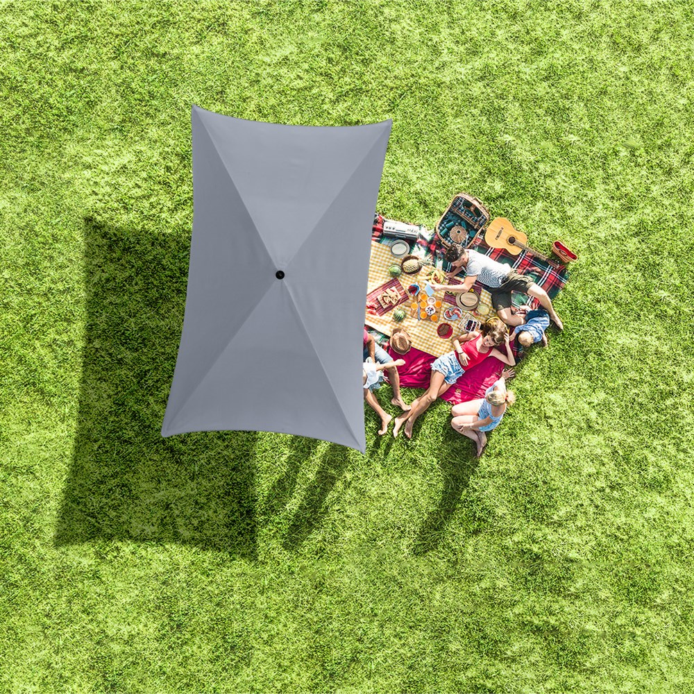 Moderner, rechteckiger Sonnenschirm mit Gestell in Titan-Finish, Knickvorrichtung und mit Volant Einfache Handhabung durch Sicherheitsschieber, sehr stabile Fiberglasschienen, zweiteiliger und stufenlos höhenverstellbarer Stock mit Knickvorrichtung zur Neigung des Schirms, Stock in edlem Titan-Finish, Unterstock mit ca. 119 cm Länge und Drehfeststeller zur sicheren Fixierung, komfortables Tragefutteral, hochqualitativer Bezug mit einer Grammatur von ca. 200 g/m² und Lichtschutzfaktor UPF 50+, exklusive Füllständer (Art. 8920 oder Art. 8905) / Erdspieß (Art. 8939)