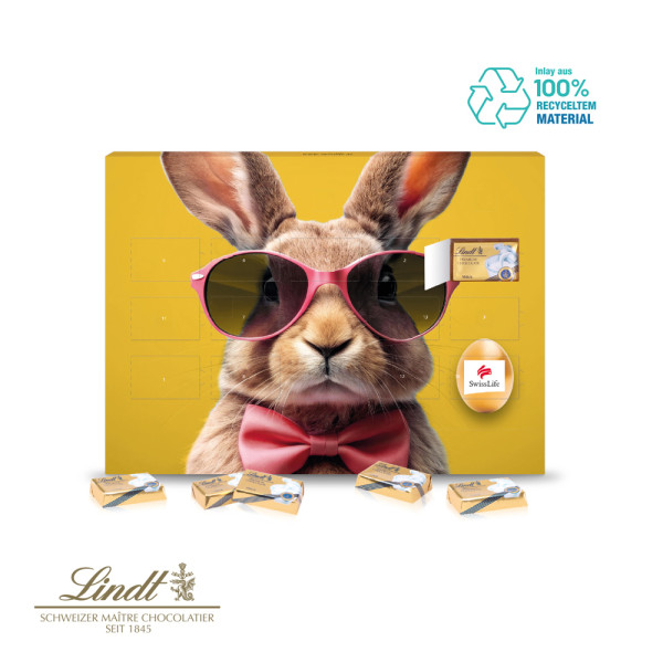 Tag für Tag ein Stück Lindt-Genuss! Dieser Osterkalender der Spitzenklasse, gefüllt mit zartschmelzender Lindt Schokolade verspricht 14 exklusive Genussmomente. Ein hervorragendes Kunden- und Mitarbeitergeschenk. Produktdetails: Schokoladen-Osterkalender in hochwertiger Vollkartonhülle im Querformat, mit praktischem Tischaufsteller zum Ausklappen. Nachhaltigkeit: Für jede Bestellung mit uns wird ein Baum über GROW MY TREE gepflanzt. Wir verwenden FSC® zertifizierten Karton aus nachhaltiger Forstwirtschaft und anderen kontrollierten Quellen. Inlay aus 100 % recyceltem Material hergestellt (z.B. aus recycelten Getränkeflaschen), 100 % recycelbar.