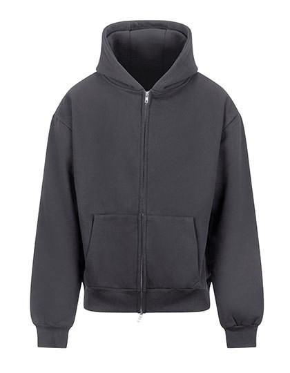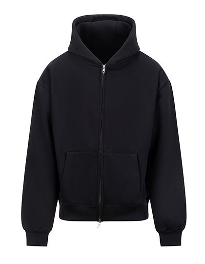 Ringgesponnene Baumwolle | 10% recycelter Polyester | Oversized-Passform | Schweres Material | Doppellagige Kapuze mit drei Segmenten | YKK-Zwei-Wege-Reißverschluss | Keine Kordelzüge | Gerippte Ärmelabschlüsse und Saum | Gebürstetes Innenvlies | Abreißetikett | 100 % Baumwoll-Obermaterial