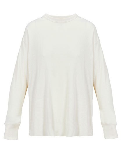 Ungefärbte Baumwolle, davon 20% recycelt | Geschnitten und genäht | Lange Ärmel mit Ripp-Bündchen | Ausschnitt und Overlock-Nähte an der Unterseite aus Ripp-Gewebe | Lockere Passform