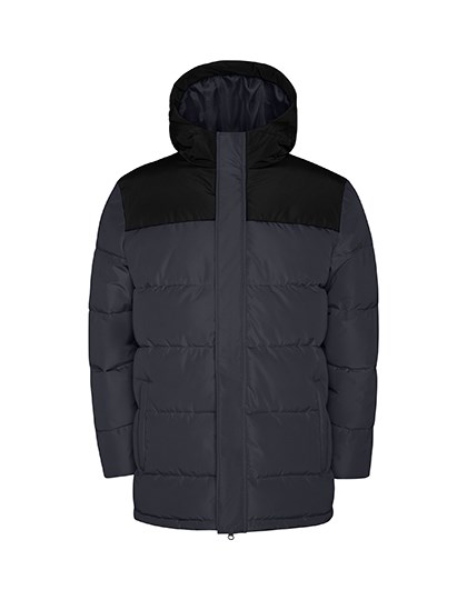 Gepolsterte Jacke mit fester Kapuze | Frontreißverschluss mit Patte, die den Reißverschluss verdeckt | Kinnschutz | Zwei Seitentaschen mit Reißverschluss | Elastische Bündchen | Veredelungszugang im Rücken und auf der linken Brustseite