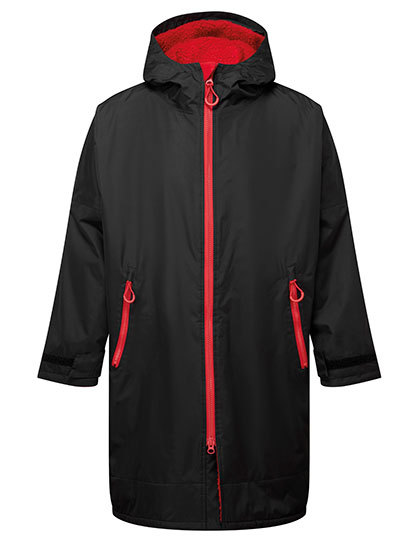 Unisex | Oversized | Durchgehender Zwei-Wege-Reißverschluss aus Kunststoff mit leicht zu bedienenden Schiebern | Kinnschutz | Oversized-Passform | Seitliche Belüftungsöffnungen | Verstellbare Ärmelbündchen mit Klettverschluss | Seitliche Reißverschlusstaschen | Innentasche mit Reißverschluss auf der linken Seite | Aufgesetzte Innentasche auf der rechten Seite | 3-teilige Kapuze | Schlaufe in der Mitte der Rückseite der Jacke zum Aufhängen des Bademantels | Verlängerter Saum hinten | Zugang zum Stickbereich auf der Rückseite, Brustbereich auch hier zugänglich | Wasserdichte, versiegelte Nähte | Innenseite aus Sherpa-Fleece | Transporttasche mit doppeltem Kordelzug