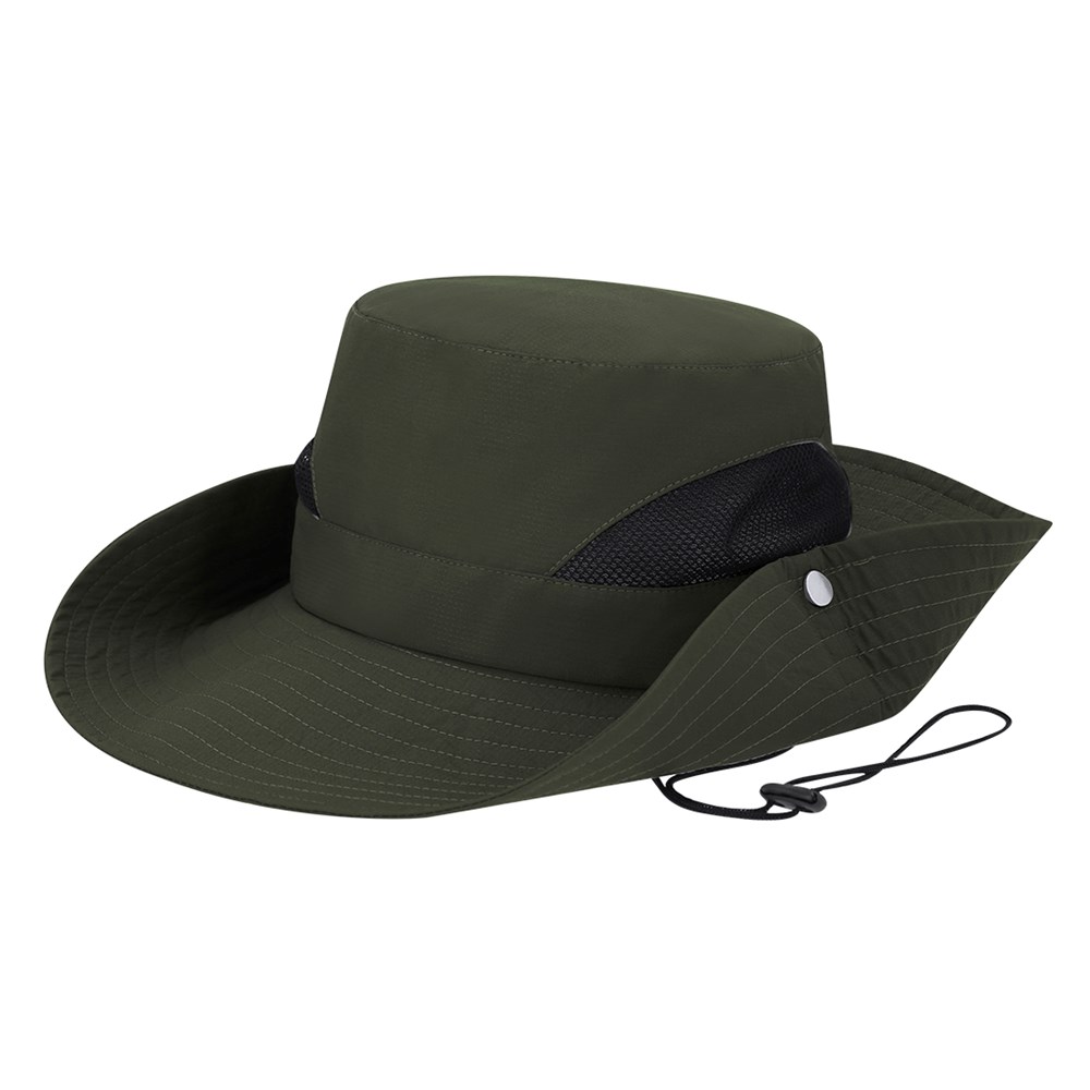 Safari-Hut aus strapazierfähigem Polyester. Mit bequemem Innenfutter, seitlichen Belüftungsgittern aus atmungsaktivem Stoff. Verstellbare Krempe mit metallischen Druckknopfverschlüssen und verstellbarem Tragekordel.
