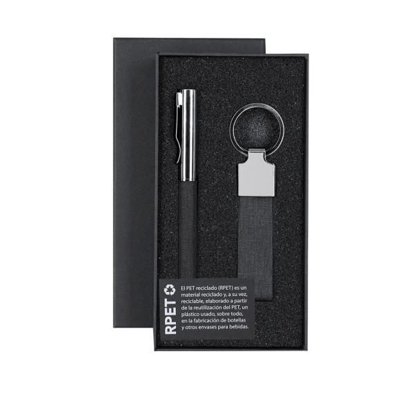 Elegantes Set aus RPET mit zweifarbiger schwarzer Oberfläche und metallischen Details. Enthält:-RPET-Kugelschreiber in zweifarbiger schwarzer Ausführung mit metallischen Details. Mit Drehmechanismus und blauer Tinte.-RPET-Schlüsselanhänger in zweifarbiger schwarzer Ausführung mit verchromten Zubehör.Präsentiert in einer einzelnen schwarzen Verpackung. Enthält eine schwarze Innkarte mit RPET-Merkmal.Das RPET-Material wird aus recyceltem Kunststoff hergestellt, um die Wiederverwendung von Kunststoffabfällen zu fördern und zur Nachhaltigkeit des Planeten beizutragen.