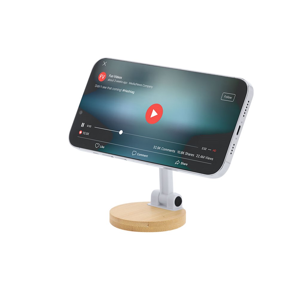 Faltbarer Ständer für Smartphones. Mit magnetischer Befestigung, MagSafe und verstellbarer Position für mehr Komfort. Inklusive einem klebbaren Metallring.Materialien wie Bambus fördern die Verwendung von natürlichen Rohstoffen und reduzieren die Emissionen schädlicher Stoffe. Er stammt von einer Pflanze mit hoher Festigkeit und Vielseitigkeit, die schnell wächst und sich regeneriert und eine hervorragende Alternative zur Verwendung von traditionellem Holz darstellt.