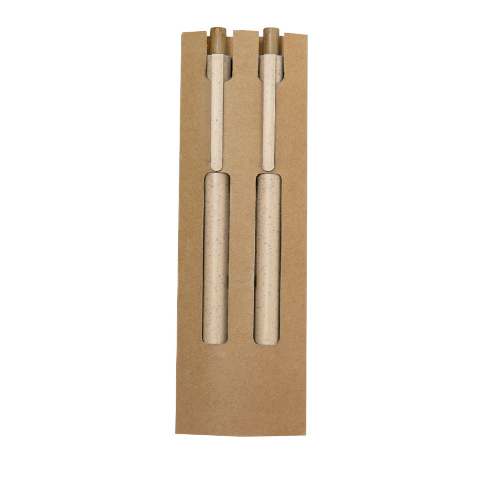 Set aus Tintenroller und ewigem Bleistift, hergestellt aus Weizenstroh und Bambus. Tintenroller mit Druckmechanismus aus Bambus in blauer Tinte und passendem Clip. Und Bleistift mit Druckmechanismus aus Bambus und ewiger Mine, um immer denselben Bleistift zu verwenden und Abfall zu vermeiden. Präsentiert in einer Schachtel aus recyceltem Karton. Mit gedrucktem Weizenstroh-Symbol.Hergestellt aus pflanzlichen Materialien, um die Verwendung von natürlichen Rohstoffen zu fördern und die Schadstoffemissionen zu reduzieren.