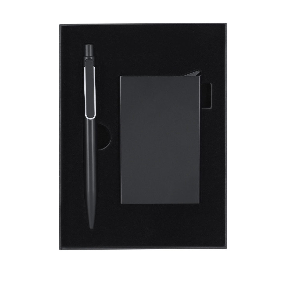 Set aus Kugelschreiber und Kartenetui, hergestellt aus recyceltem Aluminium.Das Set umfasst:- Matt schwarzen Kugelschreiber aus recyceltem Aluminium mit Druckmechanismus, Clip und dekorativem Element aus poliertem Metall. - Schwarzes Kartenetui aus recyceltem Aluminium, geeignet für 6 Karten mit RFID und Druckmechanismus zum Herausnehmen der Karten.Beide mit eingraviertem Logo für recyceltes Aluminium und in einer eleganten schwarzen Box mit Stanz-Innenteil präsentiert. Recyceltes Aluminium ist ein Material mit fast unendlichen Recyclingmöglichkeiten, ohne seine ursprünglichen Eigenschaften zu verlieren und weniger Energie in diesem Prozess zu verbrauchen.Zertifizierung GRS (Global Recycled Standard), die die recycelte Herkunft des verwendeten Materials zur Herstellung des Produktes garantiert.