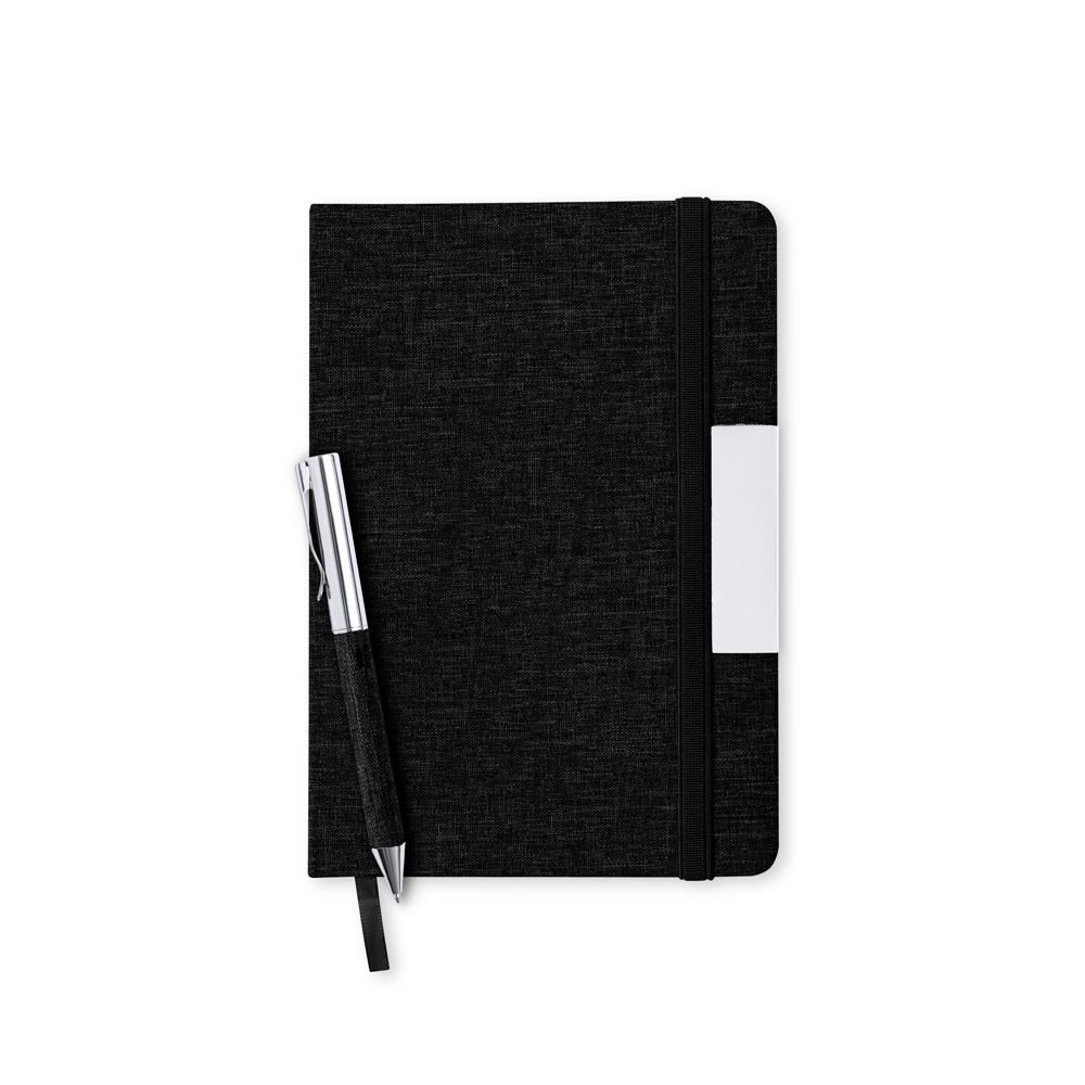 Set mit Notizbuch und Kugelschreiber aus RPET, hergestellt aus recyceltem Kunststoff, um die Wiederverwendung von Kunststoffabfällen zu fördern und die Nachhaltigkeit unseres Planeten zu unterstützen. Enthält:Notizblock mit festem Einband, mit Metalldetails auf dem Einband, Lesezeichen aus Stoff und passendem Gummiband. 100 linierte Seiten und RPET-Vermerk auf der hinteren Umschlagseite.Verchromter Metallkugelschreiber mit RPET-Polyester-beschichtetem Gehäuse. Eleganter Metallclip und passendes Zubehör, Drehmechanismus und blauschreibende Tinte. Mit RPET-Logo auf dem Gehäuse.Das Set wird in einer eleganten schwarzen Designertasche mit separatem Fach für Notizblock und Stift präsentiert.