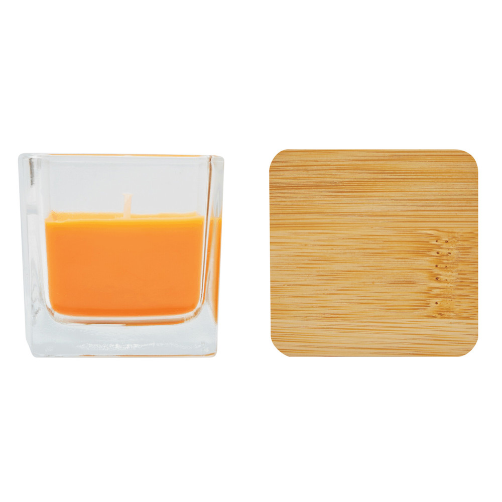 Duftkerze GLOW: in quadratischem Glas, farbiges Wachs mit Vanille-Duft, abnehmbarer Bambusdeckel mit Silikon-Dichtring, Brenndauer ca. 8 Stunden, in Box