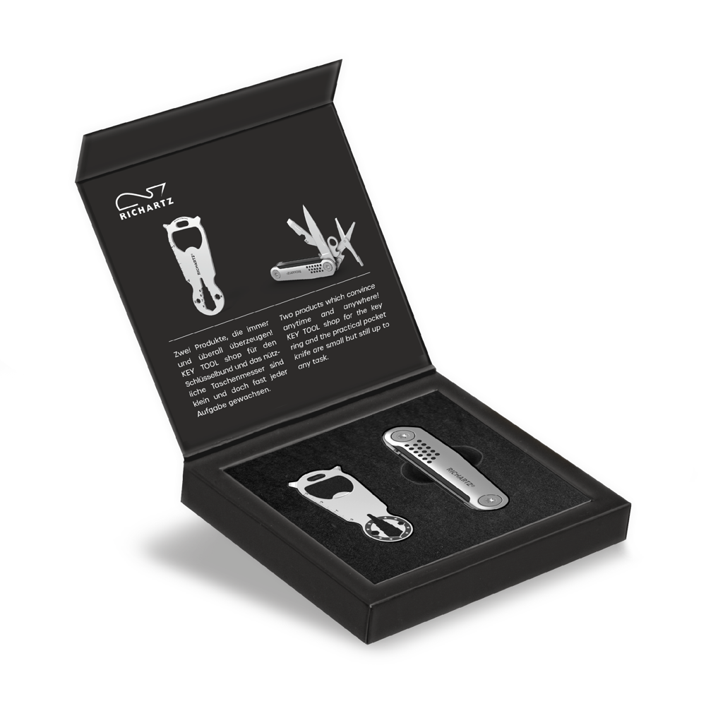 Die vielen nützlichen Funktionen der beiden Problemlöser sind ein Mehrwert im Alltag und durch die lange und häufige Nutzung ist ein dauerhafter Werbeerfolg garantiert. Durch die hochwertige Geschnekverpackung wirkt das Set ansprechend und verstärkt die positive Bindung von Marke zu Kunde.