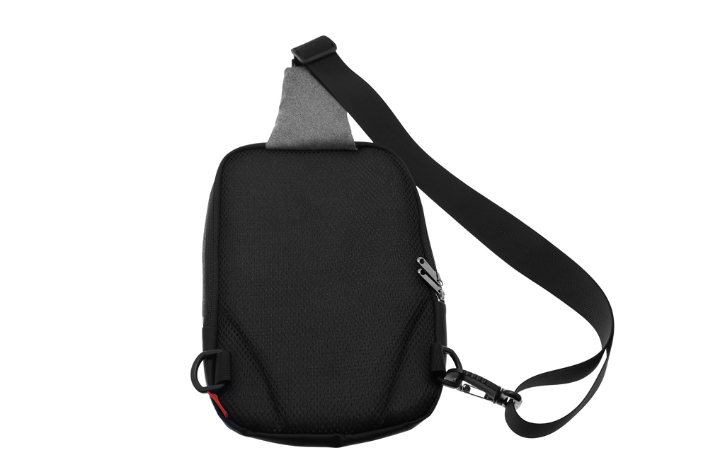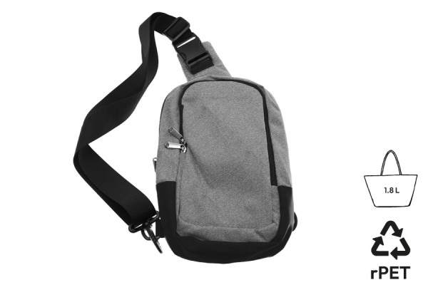 Aus Wulong-Stoff in meliertem Grau, RPET 130g/m². 2 große Stauräume mit Reißverschluss, jeweils mit einer Trennwand. Komplett gefütterte Innenräume. Rückseite des Produkts gepolstert. Verstärkung aus Kunstleder unter der Tasche. Verstellbarer Schulterriemen aus Nylon. Kann links oder rechts getragen werden. Volumen: 1,8 L.