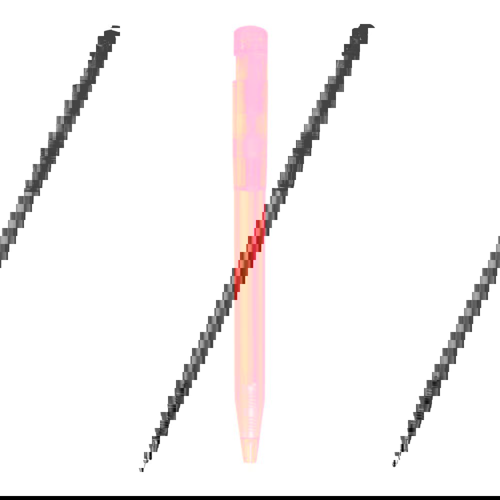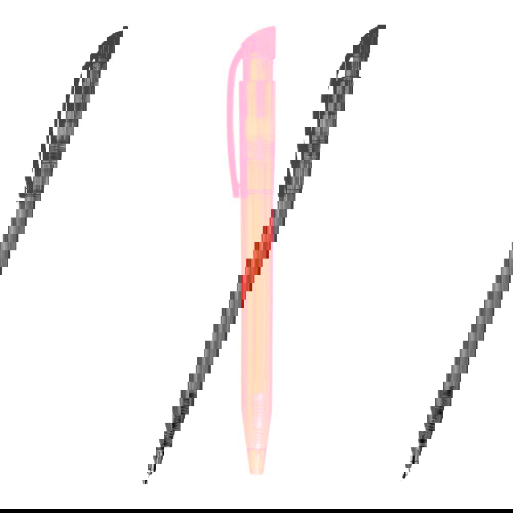 Moderner transparenter Kugelschreiber mit gebogenem Clip. Ein beliebter Werbeartikel wegen seiner großen Druckfläche. Druckkugelschreiber ausgestattet mit einer blau schreibenden X20-Refill-Mine. Druckkugelschreiber aus ABS, hergestellt in Europa. Ab einer Abnahmemenge von 5.000 Stück sind eigene Farbkombinationen möglich.