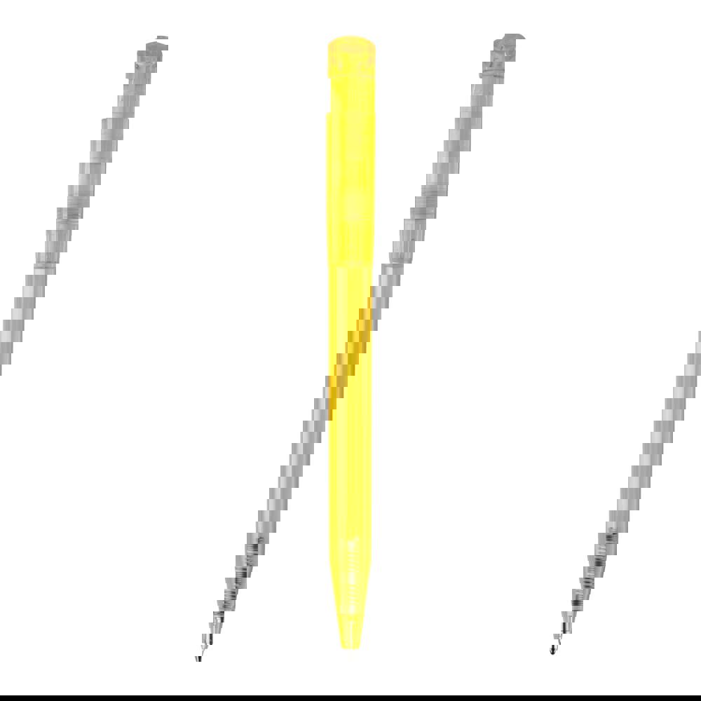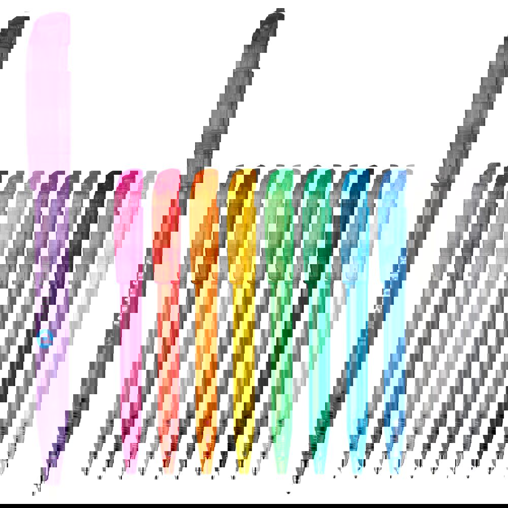 Moderner transparenter Kugelschreiber mit gebogenem Clip. Ein beliebter Werbeartikel wegen seiner großen Druckfläche. Druckkugelschreiber ausgestattet mit einer blau schreibenden X20-Refill-Mine. Druckkugelschreiber aus ABS, hergestellt in Europa. Ab einer Abnahmemenge von 5.000 Stück sind eigene Farbkombinationen möglich.
