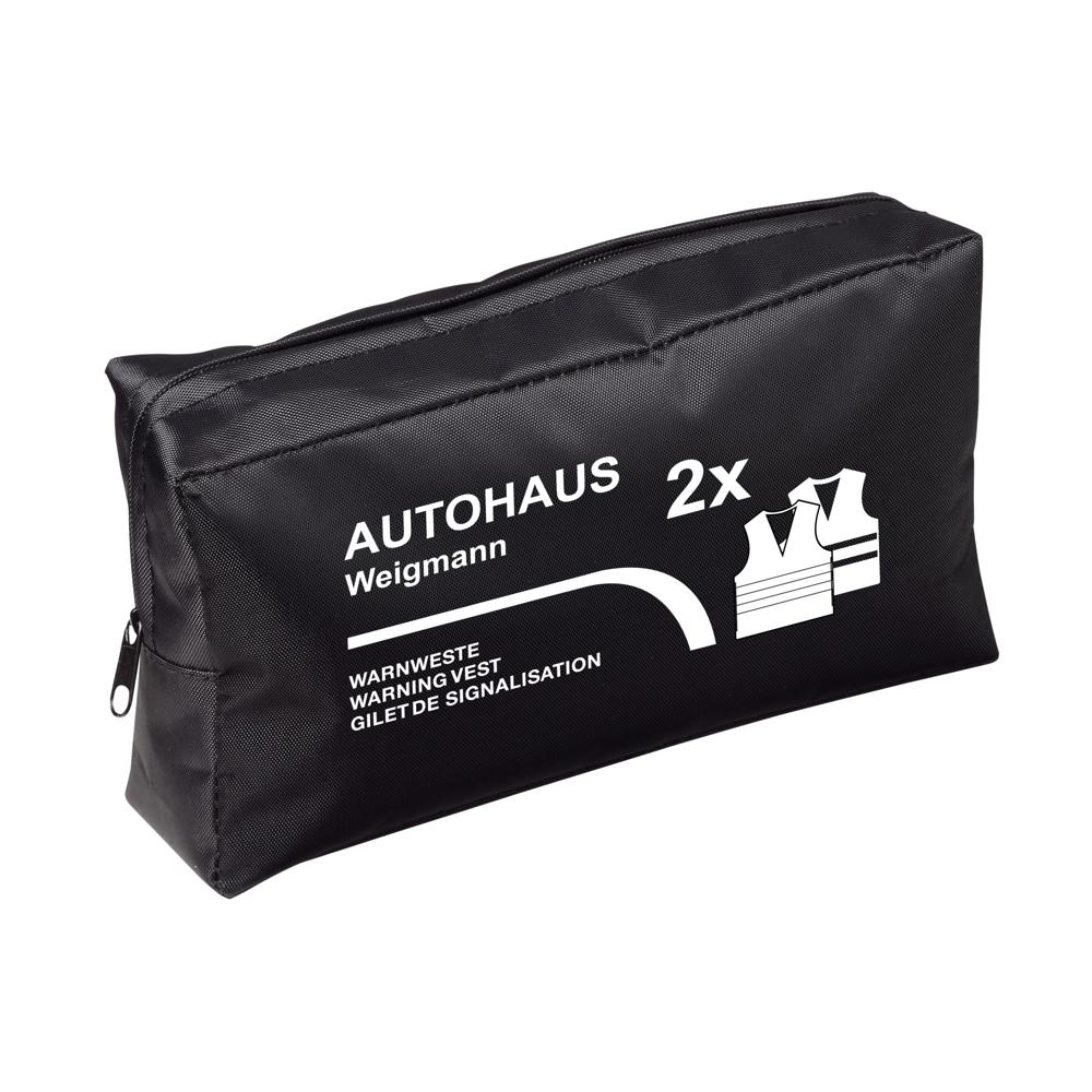 Ideal für jeden Zweisitzer. Zwei Warnwesten mit stark reflektierenden Reflektionsstreifen zum optimalen Schutz bei Dunkelheit. Einheitsgröße XXL. Praktisch verpackt im schwarzen Nylontäschchen. Entspricht den Anforderungen der EU-VO 2016/425, Klasse II und der Norm EN ISO 20471:2013+A1:2016. Warnwesten-Set bestehend aus 2x Warnweste Standard 09004. Im Siebdruck nur in schwarz, silber oder silber reflektierend veredelbar. Aus 100 % Polyester.