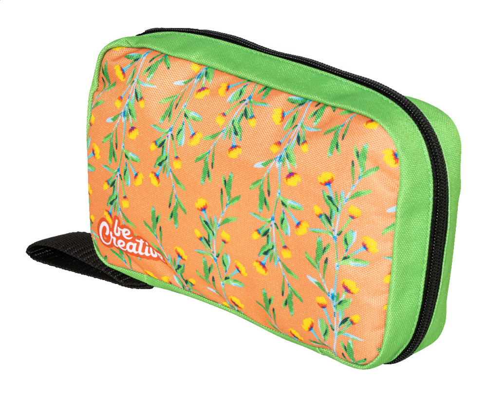 Individuelle Kabelorganizer-Tasche aus RPET mit Reißverschluss und Netzinnenfächern. Mit vollflächigem Sublimationsdruck. Material: 600D RPET-Polyester. Mindestmenge: 25 Stk. Mit RPET-Label.