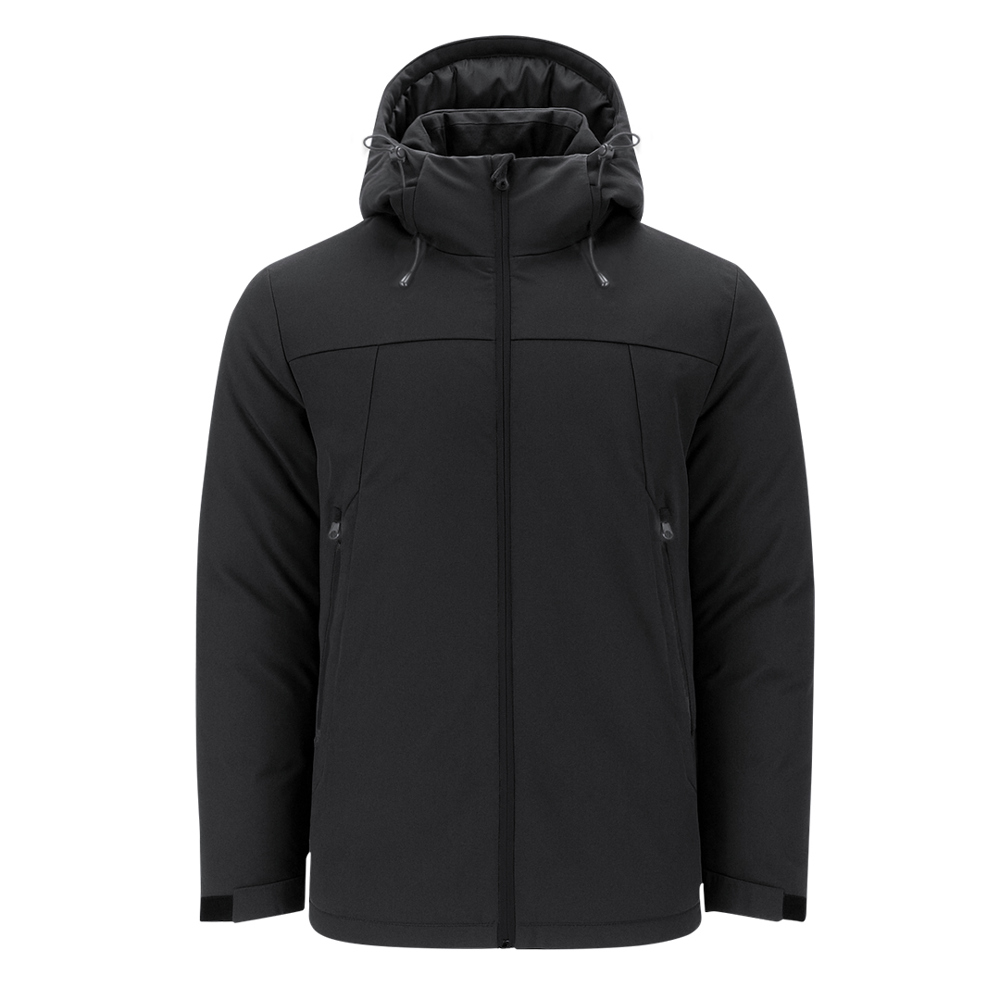 Unisex Steppparka mit verstellbarer fester Kapuze. Mit schwarzem Frontreißverschluss und Kinnschutz für mehr Komfort und Schutz, zwei Seitentaschen mit schwarzem Reißverschluss sowie Ärmelbündchen mit Klettverschluss verstellbar.