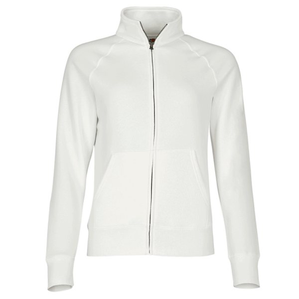 Premium-Sweatjacke für Damen von Fruit of the Loom mit zwei aufgesetzten Taschen und verdecktem Reißverschluss. Stehkragen mit Single-Jersey-Nackenband und Bündchen aus Baumwolle/Elastan-Ripp sorgen für angenehmen Tragekomfort. Seitennähte definieren eine feminine Passform.