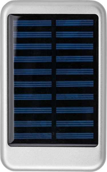 Solarstrom-Powerbank aus Aluminium mit blauen Kontrollleuchten. USB- und USB-C-Anschluss. Eingang DC5V/1A. Ausgang 5V/1A. Kapazität: 4.000mAh. Inklusive USB-Kabel.