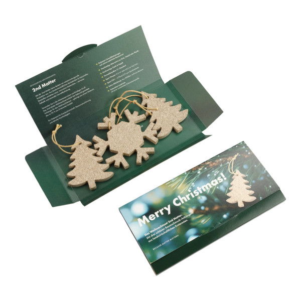 Das 2nd Matter Weihnachtsset bringt Nachhaltigkeit an den Weihnachtsbaum. Enthalten sind drei liebevoll gefertigte Anhänger aus 96 % Ernteresten. Innen und außen nach Wunsch gestaltbar – ideal für stimmungsvolle und umweltfreundliche Weihnachtsgrüße.
