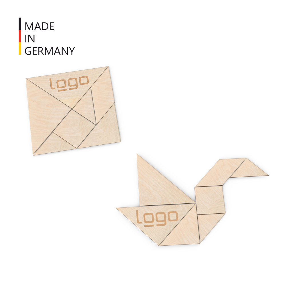 Mit unserem Tangram Kreativ-Puzzle (FSC® zertifiziert), auch bekannt als „Siebenbrett“, verbinden Sie Spielspaß mit nachhaltigem Denken. Die sieben Tans in geometrischen Formen wie Dreiecken oder Quadraten bieten unbegrenzte Gestaltungsmöglichkeiten. Es sind über 6.000 Legemöglichkeiten bekannt – ob Menschen, Tiere, Gegenstände oder abstrakte Muster, Ihrer Kreativität sind keine Grenzen gesetzt. Das Puzzle, oft auch "Siebenschlau" genannt, lässt sich durch Lasergravur personalisieren – ob Firmenlogo, Name oder ein individuelles Motiv. Verpackt wird es standardmäßig in einem umweltfreundlichen Pergamin-Flachbeutel. Gegen Aufpreis ist auch ein robustes und schickes Baumwollsäckchen erhältlich. Die Veredelung und Produktion des Tangrams ist "made in Germany". Ein vielseitiges Produkt für kreative Köpfe, das Freude bereitet und ein Zeichen für Nachhaltigkeit setzt! FSC Mix Credit (TSUD-COC-001718-NA)
