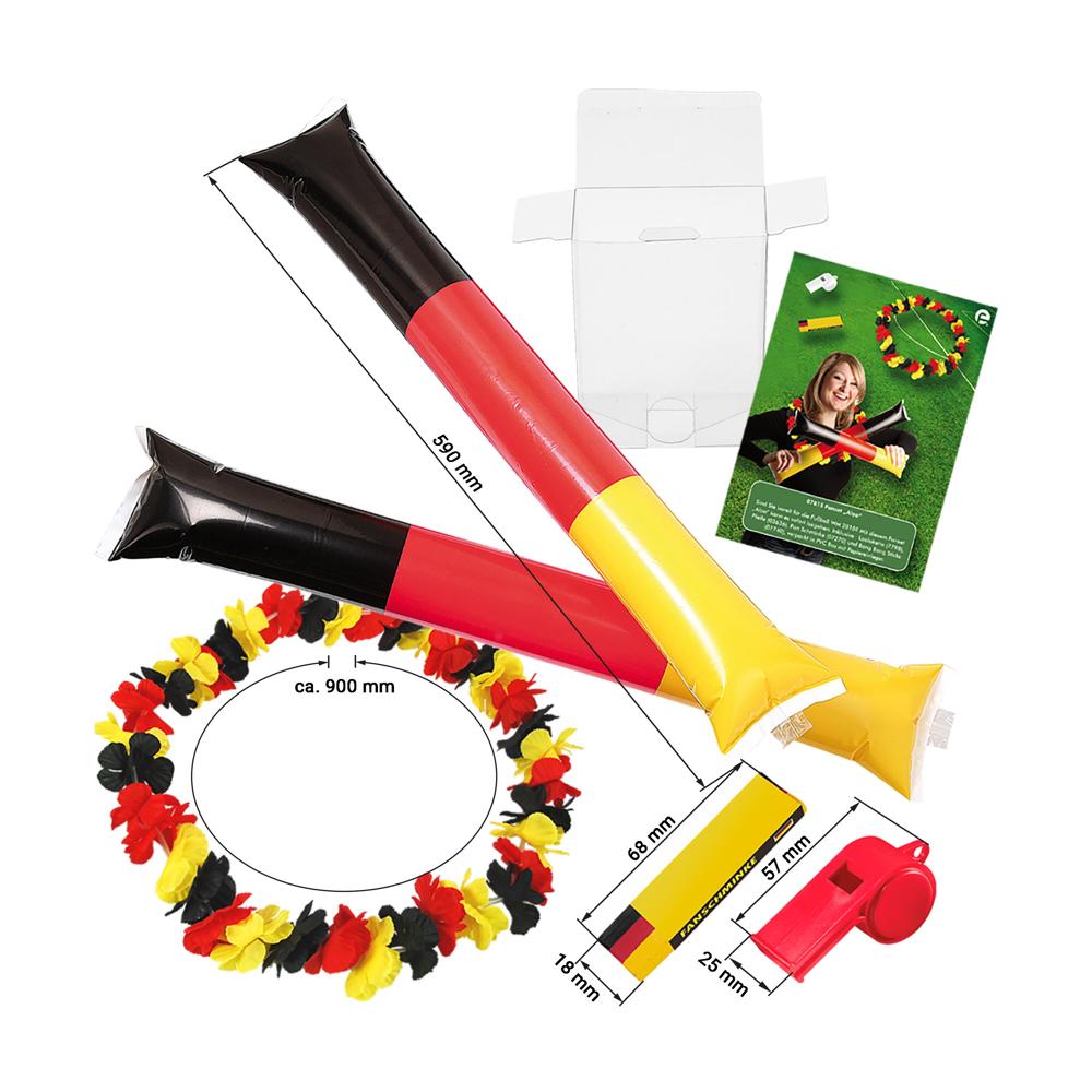 Inklusive Laolakette (07798), Pfeife (03636), Fanschminke (07270) und Klopfschlauch "Sticks" (07740), verpackt in PVC Box mit Papiereinleger. Beim Einleger kann zwischen Standard (siehe Abbildung) oder einem individuell gestalteten Einleger gewählt werden.