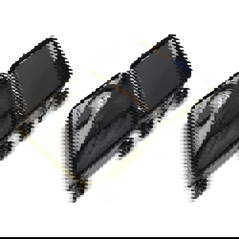 Dieser Kabinentrolley vereint Stauraum und Benutzerfreundlichkeit. Er passt in die meisten Flugzeugfächer und hält wichtige Utensilien griffbereit. Mit vier Lenkrollen, Zahlenschloss und Handyhalterung im Griff macht er das Warten am Flughafen, Bahnhof oder Bahnsteig deutlich angenehmer.