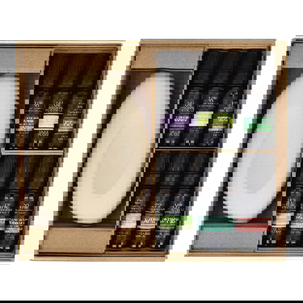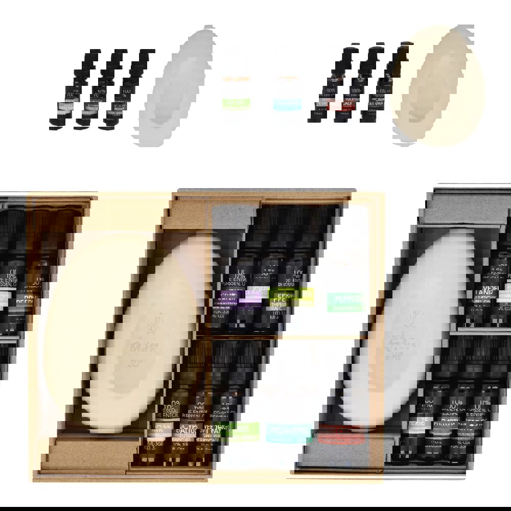 Verwandeln Sie Ihren Raum in eine beruhigende Oase mit diesem InSideOut Aroma Pebble Geschenk-Set mit 6 ätherischen Ölen. Dieses Set besteht aus einem schönen, unglasierten Keramikstein, der weder Strom noch Wärme benötigt und somit eine sichere und natürliche Möglichkeit bietet, die wohltuende Wirkung der Aromatherapie zu genießen. Das Set enthält sechs hochwertige ätherische Öle (je 10 ml), mit denen Sie Ihr persönliches Dufterlebnis mit einer Vielzahl von Düften gestalten können, die Entspannung, Konzentration oder Kräftigung fördern. Geben Sie einfach ein paar Tropfen Ihres Lieblingsöls auf den Stein und lassen Sie ihn den Duft aufnehmen und in Ihrem Zuhause, Büro oder am Arbeitsplatz verbreiten. Stellen Sie ihn in Ihren Flur, Ihr Wohnzimmer oder Ihr Büro. Wählen Sie den Duft, der am besten zu Ihrer Stimmung oder der Atmosphäre passt, die Sie schaffen möchten, und genießen Sie den ganzen Tag lang die ruhige, erfrischende Atmosphäre. Schön verpackt in einem Geschenkkarton ist das Set ein schönes Geschenk für Angehörige und Freunde. Verschiedene Duftöle im Paket Lavendel - Pfefferminze - Süße Orange - Eukalyptus - Sandelholz - Zitronengras