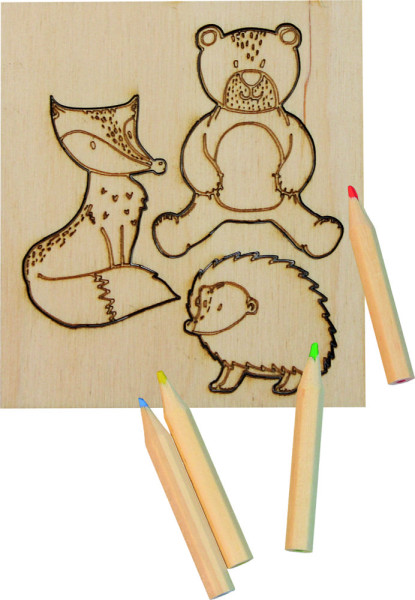 Nach Lust und Laune ausmalen. 3 Wildtiere gelasert auf einer 3mm Birkensperrholzplatte (naturbelassen), die auch herausgebrochen werden können. Inklusvie 4-teiligen Buntstiftset. Verpackt in einer Papiertüte.