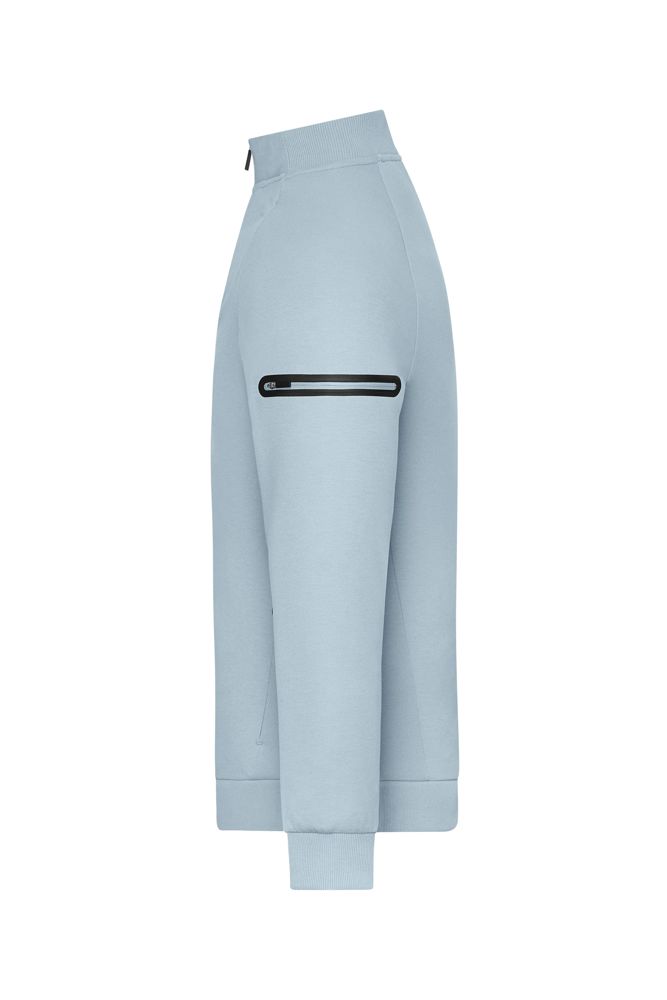 Hochwertige Interlock-Qualität Angenehme Materialmischung aus BIO-Baumwolle, recyceltem Polyester und Elasthan Technische Details Stehkragen Durchgehender Reißverschluss 1 Reißverschlusstasche umrandet mit modischem Tape auf linkem Ärmel 2 seitliche Reißverschlusstaschen Arm- und Bundabschluss mit elastischen Bündchen 8053: leicht tailliert 1/2 Oberweite: 52 cm 1/2 Taillenweite: 49 cm 1/2 Saumweite: 47 cm Länge ab Schulter: 68 cm Armlänge Raglan: 79,50 cm OEKO-TEX® Standard 100 (15.0.70467) Raglan Bio Baumwolle OCS Standard blended RCS blended Stehkragen