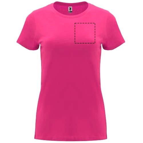 Tailliertes kurzärmeliges T-Shirt für Damen. Rundhalsausschnitt mit 1×1 Rippstrick. Verstärkte und verdeckte Nähte am Kragen. Herausnehmbares Etikett.