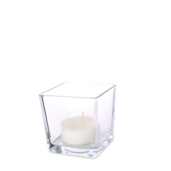 Laterne mit modernem Würfelform. Erhältlich in zwei Kapazitätsvarianten. Sie enthält ein Teelicht aus Sojawachs, das natürlich und sicher ist und beim Brennen keine schädlichen Substanzen freisetzt.