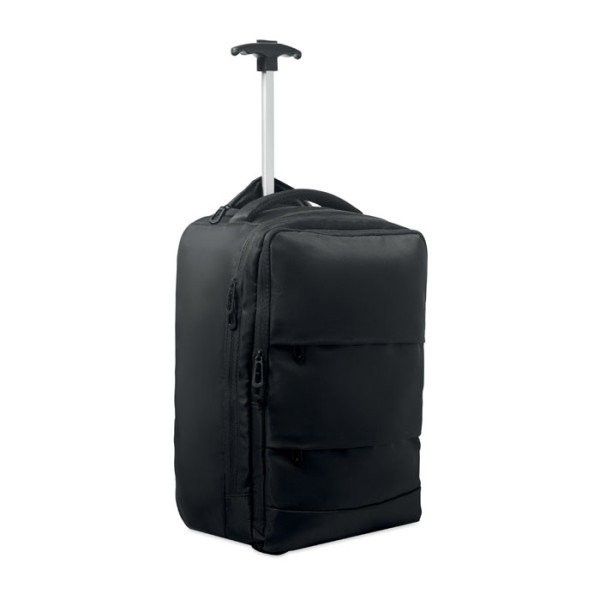 Rucksack-Trolley aus 290T RPET-Polyester. Drei Front- und eine rückseitige Reißverschlusstasche, gepolstertes 15''-Laptopfach und Kühlfach. Gepolstertes Rückenteil und Schultergurte.