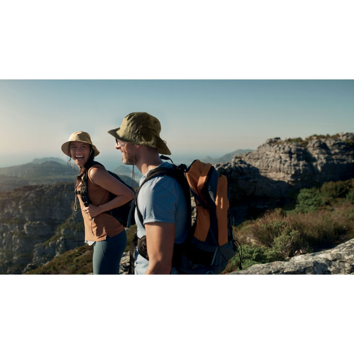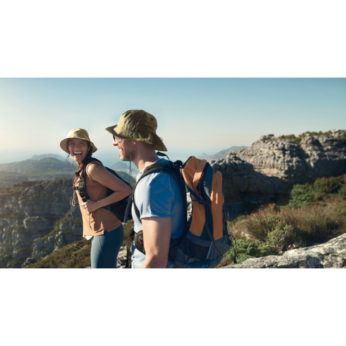 Wasserabweisender Fisherman-Hat, inkl. Beutel aus gleichem Material und ABS-Karabiner. Polyester 64 g/m².