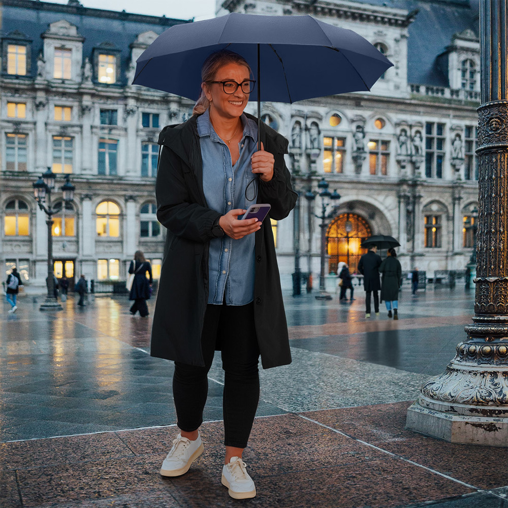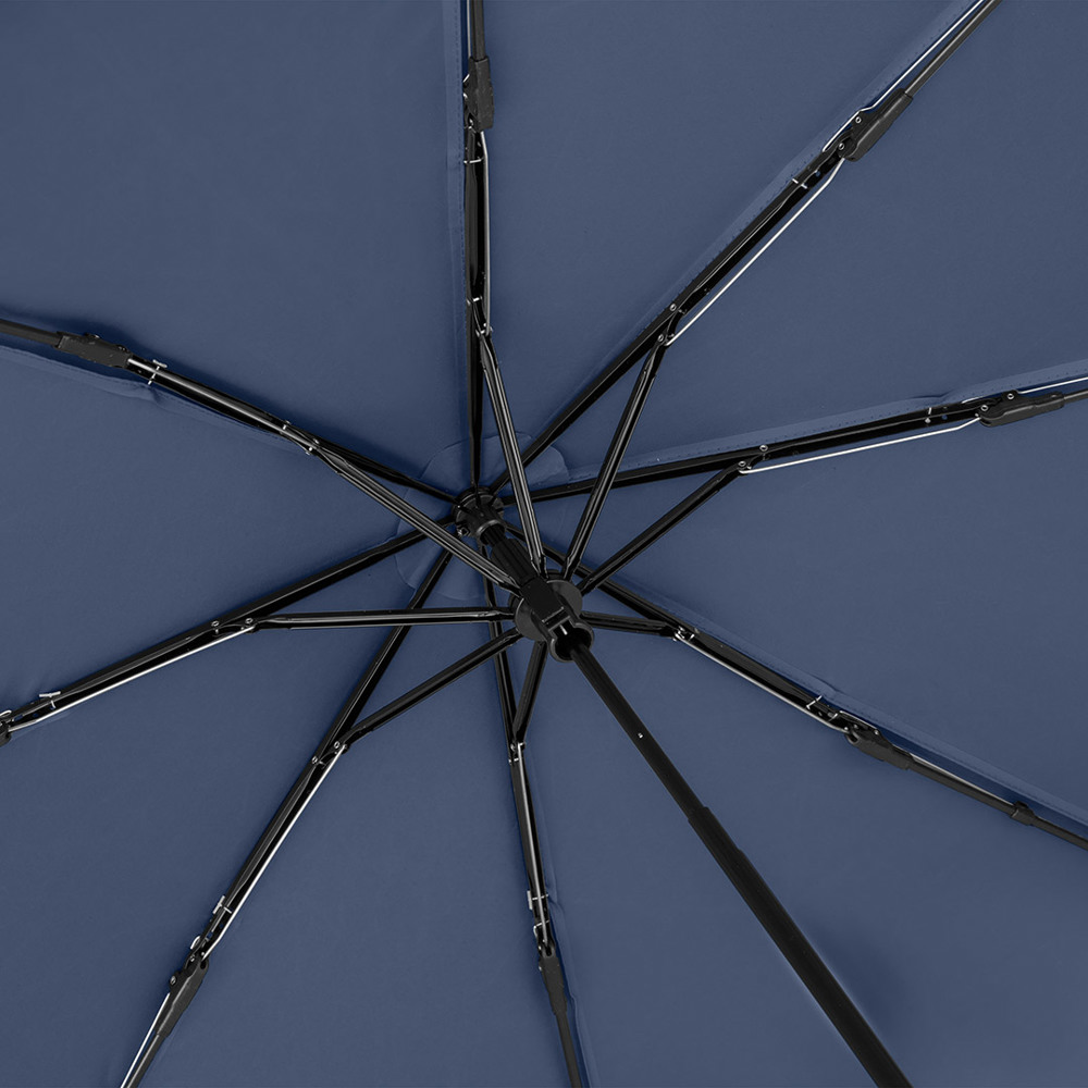 Kompakter Handöffner-Taschenschirm mit hervorragendem Preis-Leistungs-Verhältnis und Windproof-PLUS-System Einfache Handhabung durch Sicherheitsschieber, hochwertiges Windproof-PLUS-System für eine maximale Gestell-Flexibilität bei stärkeren Windböen, Soft-Feel-Griff mit elastischer Tragekordel und Werbeanbringungsmöglichkeit