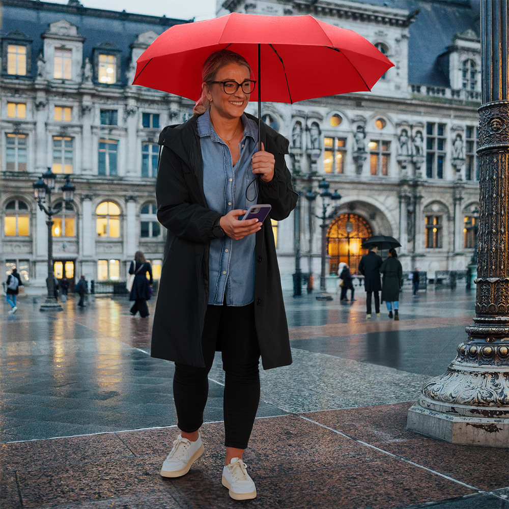 Kompakter Handöffner-Taschenschirm mit hervorragendem Preis-Leistungs-Verhältnis und Windproof-PLUS-System Einfache Handhabung durch Sicherheitsschieber, hochwertiges Windproof-PLUS-System für eine maximale Gestell-Flexibilität bei stärkeren Windböen, Soft-Feel-Griff mit elastischer Tragekordel und Werbeanbringungsmöglichkeit
