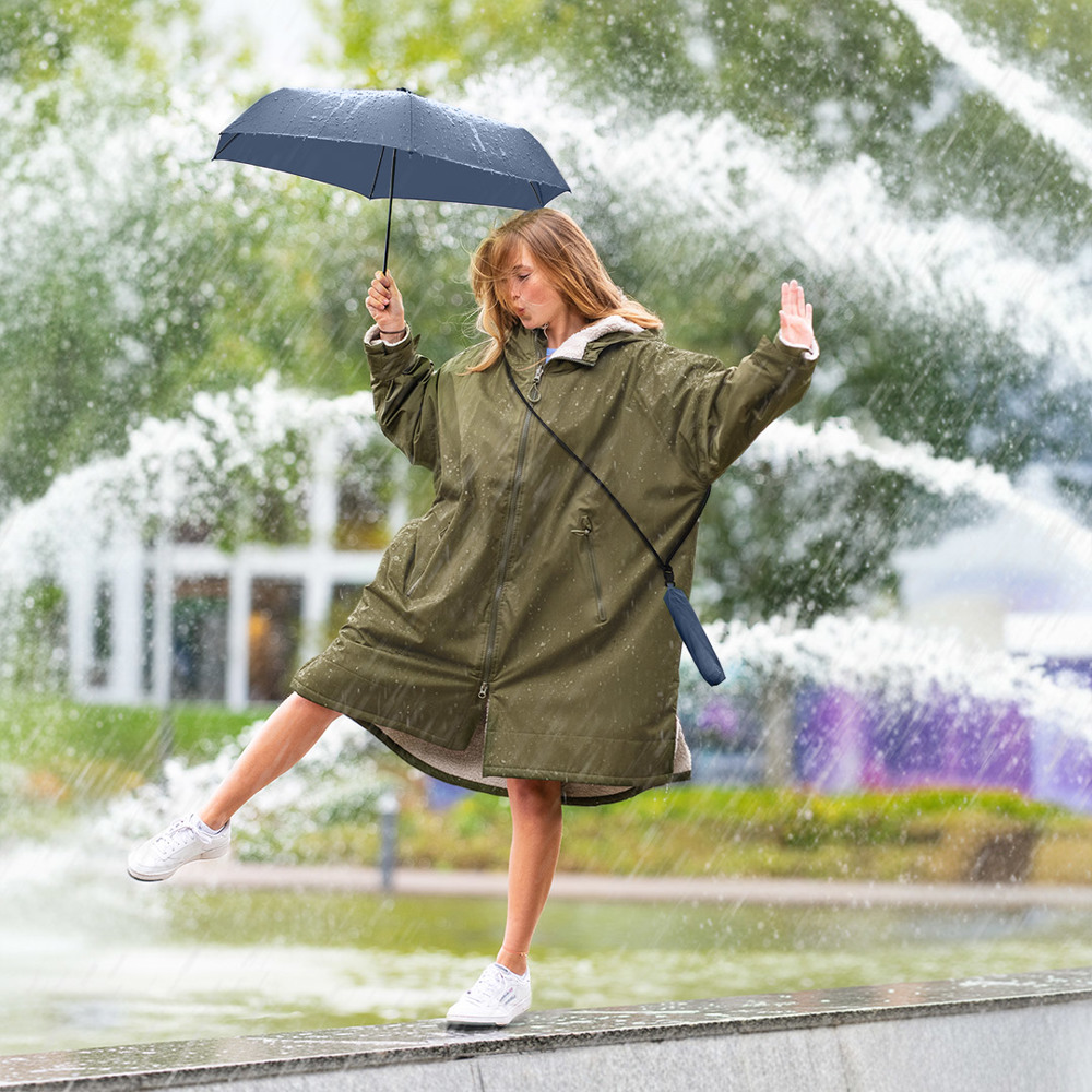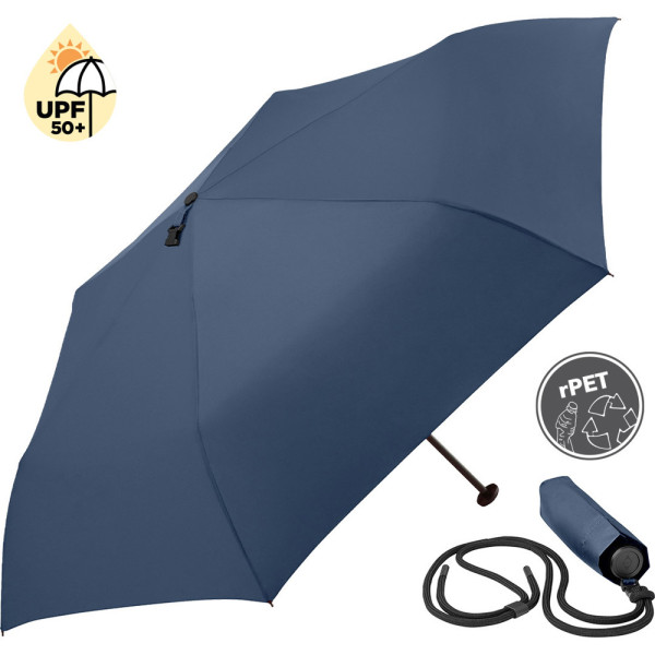 Superleichter Handöffner-Taschenschirm mit abnehmbarem Umhängeband und UV-Schutz Einfache Handhabung durch Sicherheitsschieber, hochwertiges Windproof-PLUS-System für eine maximale Gestell-Flexibilität bei stärkeren Windböen, schwarzer Aluminiumstock, extra leichtes Polyester-Pongee Bezugsmaterial aus recycelten Kunststoffen und mit Lichtschutzfaktor UPF 50+, Kunststoffgriff, Kappe und Lanyard-Klickverschluss aus recyceltem ABS (rABS), Griff mit Werbeanbringungsmöglichkeit, Befestigung des Umhängebandes per Klickverschluss am Futteral oder am Schirm möglich, einfaches Zusammenrollen des Schirms durch breites Schließband
