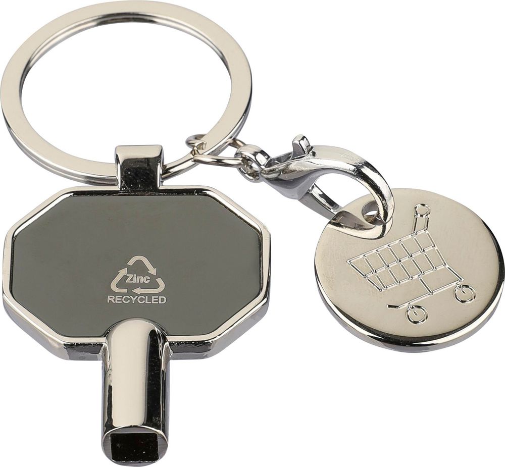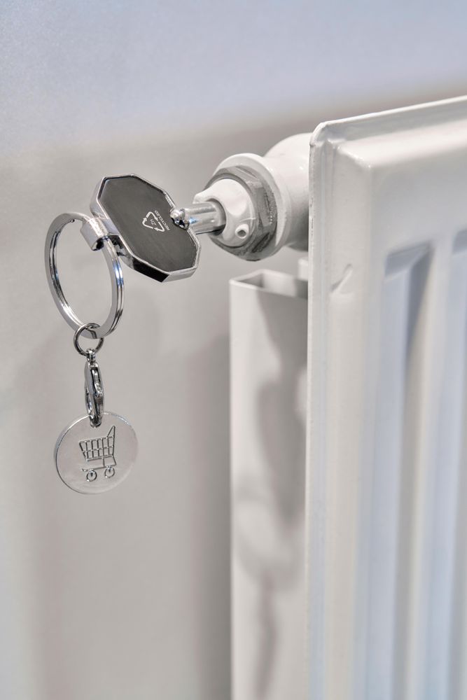 Schlüsselanhänger aus recycelter Zinklegierung mit Einkaufsmünze zum Entlüften von Heizkörpern. Mit einem 5 x 5 mm großen quadratischen Schlüssel, der in Europa am häufigsten verwendeten Größe zum Entlüften von Heizkörpern. Lieferung mit stabilem Metallschlüsselring und Recycling-Logo. Einzeln verpackt in einem braunen Kartonumschlag mit Abbildung.