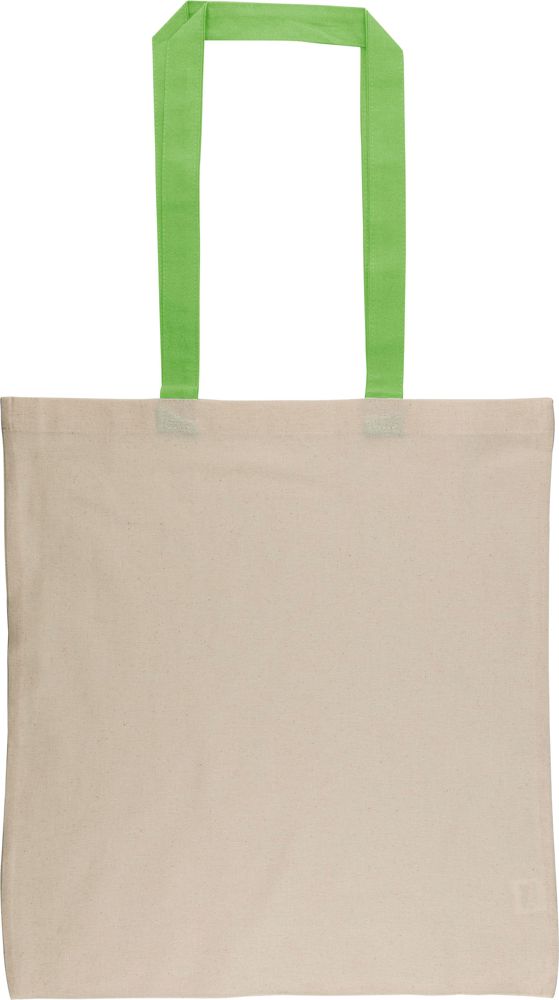 Einkaufstasche aus Baumwolle (140 g/m²) in Naturfarbe mit farbigen Griffen. Größe 38 × 42 cm mit 70 cm langen Griffen (2,5 cm breit). Dieses Produkt ist OEKO-TEX® STANDARD 100 zertifiziert.