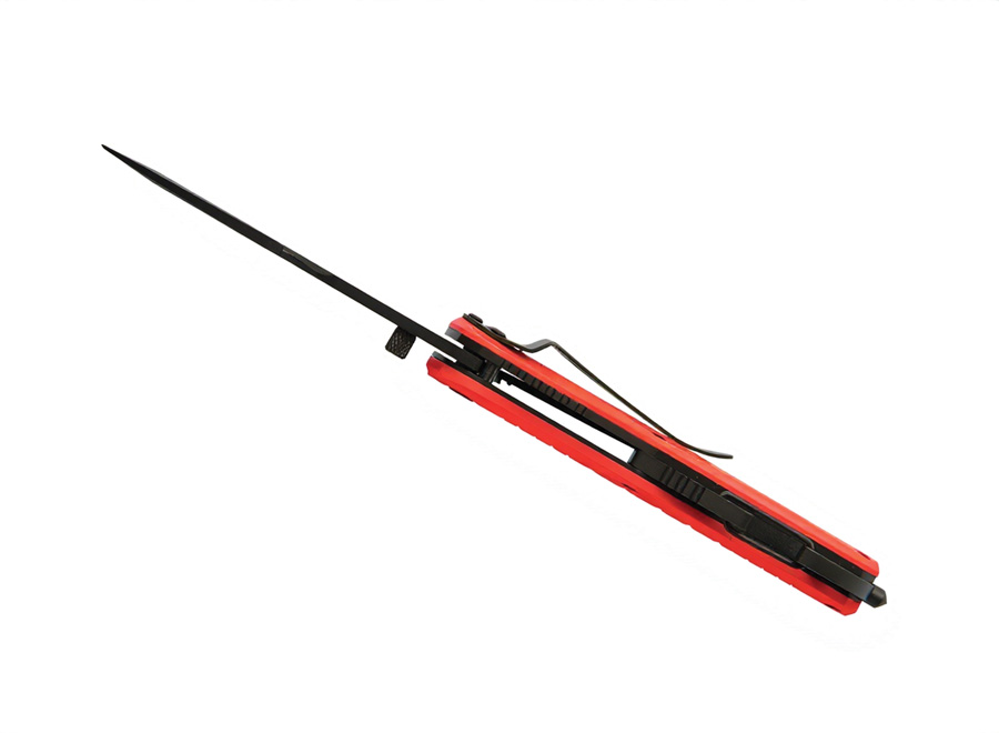 Klappbares Messer mit Klinge aus rostfreiem 420er Edelstahl und Titanbeschichtung, bestehend aus einem feinen Teil der Klinge (für präzise Schnitte) und einem teilweise gezahnten Teil (für schwierigere Schnitte). Montage mit Torx Schrauben. Griff aus rot eloxiertem Aluminium. Einhändiges Öffnen/ Schließen mit einem Liner-Lock-Sicherheitsmechanismus. Gürtelclip. Funktionen wie Gurtschneider/ Seilschneider, Wolframkarbid-Glasbrecher und Flaschenöffner. Wird in einem melierten grauen Etui aus RPET geliefert.