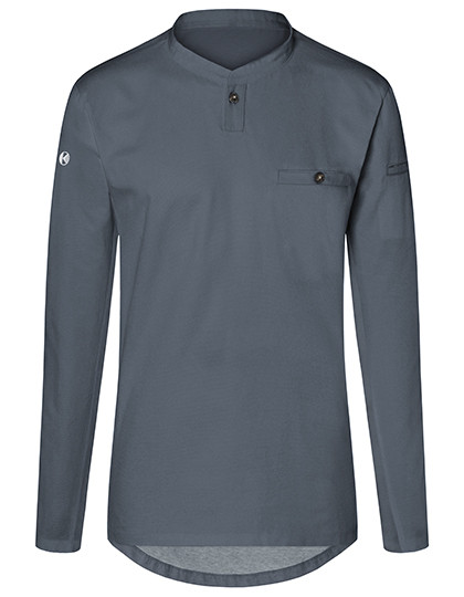Vorderseite: Köpergewebe | Rückseite: Jersey-Piqué, atmungsaktiv, feuchtigkeitsregulierend | Langen Ärmel | Tailliert geschnitten | Halsausschnitt mit schmalem Stehkragen und kleiner Knopfleiste | Brustleistentasche mit Knopf | Leistentasche am linkem Ärmel
